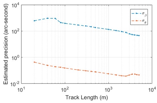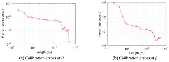 As can be seen from Figure 13, the calibration errors of β and θ decrease rapidly with the increase in track length. The calibration errors of θ can be reduced to less than 1 arc-second when a 100 m long track was used. When a 2500 m long track was used, the calibration error is close to 0.01 arc-seconds. For the β angle, although the calibration errors decrease with the increase in track length, there are still hundreds of arc-seconds of errors. Further methods should be applied to reduce its calibration errors.