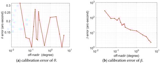 Calibration errors of θ and β with different off-nadir pointing angles. The curves are plotted in logarithmic coordinates.