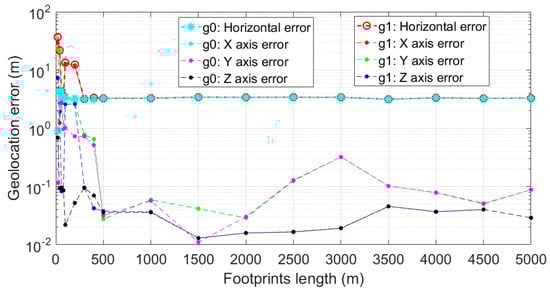Calibration results with different track lengths. Group “g0” is the calibration result with no additional offsets added in the ICESat-2 data, and group “g1” is the calibration result when additional offsets of 12 m, 12 m and 0.5 m were added in the x-axis, y-axis, and z-axis of each point, respectively, in the geographic coordinate system. The horizontal errors are calculated by , where ex and ey are the errors in the x-axis and y-axis, respectively.