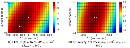 Z-difference variation with different Δθ and Δβ. The mark “★” corresponds to the actual least z-difference position. The mark “●” corresponds to the theoretical least z-difference position. (The unit of the color bar is meters, and the z-differences are shown in negative for display purposes).
