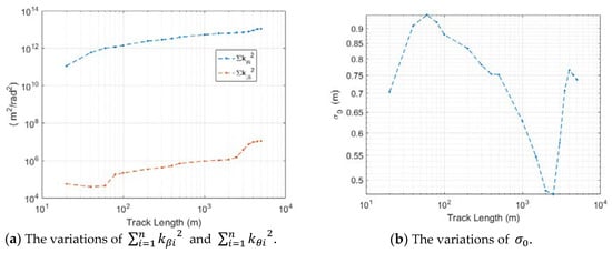 Figure 19 shows the estimated precisions based on the above error model under different track lengths; the terrain data and altimeter data from the experiment were used. In addition, Figure 20 shows the variation of , and with different track lengths.