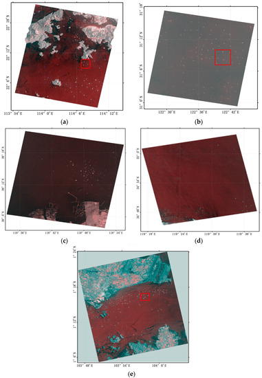 Figure 2a–e show the five RADARSAT-2 images with longitude and latitude information after geometric correction, among which, R = HH, G = HV and B = VH. The locations are the sea areas of the West Lamma Channel in Hong Kong, the Yangtze Estuary, the Yellow River Estuary, Lianyungang and Singapore, respectively. In these images, the bright dots with strong scattering echoes are ship targets, while the dark areas are the sea surface. The scattering echo intensity of the ship target is significantly greater than that of the sea surface. On the whole, many ships can be observed in Figure 2 except Figure 2d. In Figure 2a, the ships are located in the West Lamma Channel. In Figure 2c,e, the ships are mainly located near the port and shore, while in Figure 2b, there is no land area, the ships are mainly concentrated in the middle of the image, and some of the ships have strong crosswise side lobes.