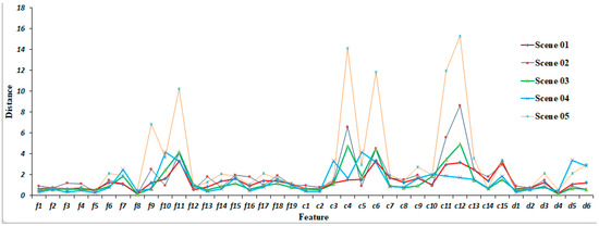 Figure 4 shows the distances between ships and the sea area for f1–f19, c1–c15, and d1–d6. In general, the trend in the distance between different features is consistent in the five images. The distances between features in CP mode are generally larger than those in FP and DP mode; the next largest distances between features are in FP mode, and the distances between features in DP mode are the smallest, especially in scenes 02 and 05. Therefore, the features from CP mode are more suitable for ship detection than those from FP and DP mode. Moreover, with larger distances, f9, f11, c4, c6, c11 and c12 have good ship detection performance. In each scene, the values of these six features are several to more than ten times the values of the other polarization features, especially in scene 05. Then, f7, c5, c15 and d5 are smaller than f9, f11, c4, c6, c11 and c12 but larger than the other features. Note that the distances of c4, c6, c11 and c12 are larger than 10 in scene 05, which indicates the best ship detection performance among these features out of scenes 01–05.