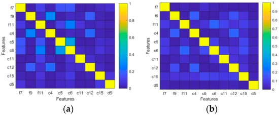 Figure 5 shows the normalized mutual information of features. Figure 5a,b are symmetric about the main diagonal, which confirms the symmetry of the mutual information mentioned above. Furthermore, the normalized mutual information between a feature and itself is 1, while the values among different features are less than 1. In general, the trends in the normalized mutual information values in (a) and (b) are consistent with low information redundancy. The features in CP and FP mode have a higher relevance than the features in DP mode, which may be due to the loss of polarization information in DP mode. In detail, the feature pairs with relatively high information overlap are (f11, c6), (f9, c4) and (c5, c6). Among these, f11 and c6 represent the alphas extracted from the H/alpha decompositions; f9 and c4 represent the polarimetric coherence extracted from HH/VV and RH/RV, respectively; and c5 and c6 represent the entropy and alpha extracted from the H/alpha decomposition, respectively. This result indicates that features from the same polarimetric decomposition have higher redundancy. For the feature pairs, (f7, c5), (f7, c6), (f9, c12), (c4, c12) and (c6, c11) have a lower redundancy than (f11, c6), (f9, c4) and (c5, c6). There is little information overlap between both c15 and d5 and the other features. Hence, combined with the Euclidean distance and normalized mutual information, c4, c6, c11 and c12 are selected for further study.