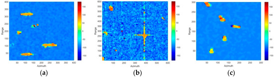 In Equation (38), the sign of the phase factor depends on the sign of . For single scattering, the value of is positive, so the value of the phase factor is negative; for even scattering, the value of the phase factor is positive [47]. Considering that ships are mainly characterized by even scattering, while sea surfaces are mainly characterized by single scattering, the sign of ships is positive, and the sign of the sea surface is negative. In other words, the phase factor is able to distinguish single scattering and even scattering to determine the dominant scattering mechanism. When the phase factor is positive, the even scattering is stronger than the surface scattering; when the phase factor is negative, the surface scattering is stronger than the even scattering. The areas shown in Figure 9a–c represent the red box insets shown in Figure 2a,b,e. The images are derived from RADARSAT-2 scenes 01, 02 and 05 respectively, which were each acquired at low sea state. In Figure 9, the sign of ships is positive, while the sign of the sea surface is negative, which means that the constant 0 can be used to distinguish ships and sea surface.