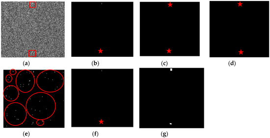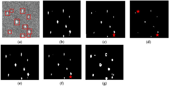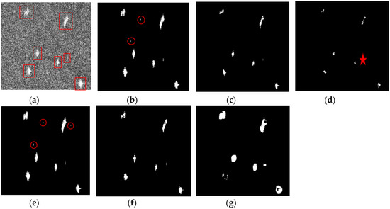 Figure 12, Figure 13 and Figure 14 show three examples of detection results in low, medium and high sea states respectively. In Figure 12, Figure 13 and Figure 14, (b)–(g) are the ship detection results of the Weibull-CFAR, Log-normal-CFAR, G0-CFAR, K-CFAR, GГD-CFAR and phase factor detectors. The red boxes and red circles represent ships matched with AIS and false alarms respectively, and the red stars represent ships undetected. In Figure 12 (low sea state), the Weibull-CFAR, K-CFAR and phase factor detectors are the best without false alarms or missing ships, while a ship is missing in Log-normal-CFAR and GГD-CFAR detection, what’s worse, two ships are missing in G0-CFAR detection.