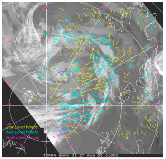 Motion vector winds from MODIS, which observes portions of the polar region approximately every 100 min. Wind tracers are identified using automated algorithms that identify trackable features from a sequence of images. The positions and direction are indicated by wind-barbs, with flags encoded for speed. Color indicates approximate altitude of the AMV.