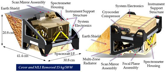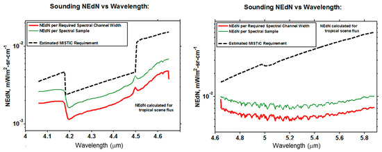 The adopted spectral range specifically excludes the very long-wave spectral channels also dominated by CO2 emission, for to include these would dramatically increase the required electrical power, instrument size, and exceed the accommodation capacity of an ESPA-class microsatellite. AIRS algorithms have advanced to the point where the temperature profile retrieval employs the shorter-wavelength CO2 emission channels to retrieve troposphere temperature, with the long-wave channels supporting cloud-clearing and the retrieval of stratospheric temperature [25]. By mission design, observation of stratospheric temperature is not essential for MISTiC, since these variables will be well-observed by the NASA/NOAA Joint Polar Satellite System (JPSS) and EUMETSAT IASI instruments for decades to come.