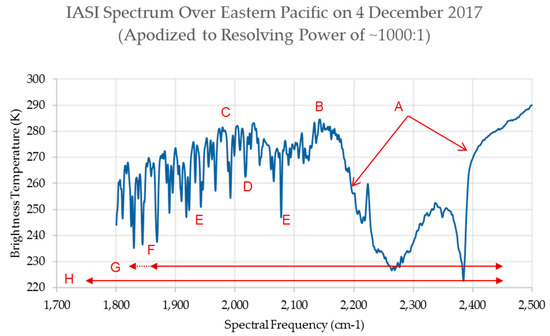 Figure 4 is an example spectrum from an IASI overpass that illustrates the planned spectral range for MISTiC observations, and key atmospheric features within this range. It includes spectral radiances strongly influenced by CO2 emission in the troposphere (near 2385 cm−1) from which the vertical temperature profile is extracted, and radiances strongly influenced by atmospheric moisture fields (between 1750 and 2000 cm−1), that, together with the temperature profile, can be used to extract vertical moisture profile. This range also includes channels strongly influenced by clouds and aerosols, and by the trace gases CO, and N2O in the free troposphere. In Figure 4, the R and P branches of the CO2 emission dominated region centered on 2385 cm−1 that are used for retrieval of the temperature profile are indicated by A. A very high transmission “super window” channel, which has utility in observing aerosols is indicated by B. Relatively high brightness channels near C are dominated by surface and boundary-layer water vapor emission. Spectral channels, such as D, are more sensitive to lower troposphere water vapor emission. Lower brightness channels, such as those indicated by E and F, are more sensitive to mid-troposphere and upper troposphere water vapor emission respectively. G indicates the spectral coverage range for the airborne MISTiC instrument. H indicates the spectral coverage range for the planned space instrument (1750 cm−1 to 2450 cm−1). As detailed in Appendix A, the airborne unit employed an off-the-shelf detector array with a nominal cutoff above 1850 cm−1. However, employing large-area spatial averaging allowed a demonstration of the spectrometer down to approximately 1830 cm−1 with the airborne unit.