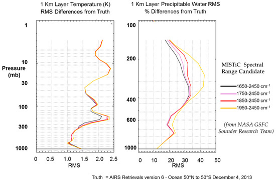 Under the NASA Instrument Incubator Program (IIP), the impact on retrieved layer RMS error for both the temperature and water vapor concentration was evaluated for different values of the lower-frequency band limit, ranging from 1950 down to 1650 cm−1. For this study, “truth” was selected to be a set of AIRS instrument retrieved temperature and moisture vertical profiles collected for cloud-free footprints over the Pacific Ocean, and retrieved using the AIRS Version 6 algorithm, which includes channels from the full spectral range of AIRS, including those in the very long wavelength infrared (VLWIR). A regression method was used by the NASA GSFC Sounder Research Team to perform this trade-study analysis. Spectral resolving power of 700:1 was used for the MISTiC spectral response function in this study.
