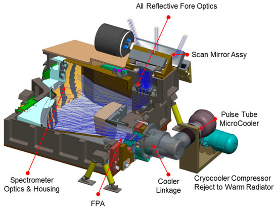 The core of the instrument is a field-imaging dispersive infrared spectrometer, shown in cut-away in Figure 7. A small scan mirror directs scene radiation into a small imaging optical assembly that focuses the light on the entrance slit of the spectrometer. The spectrometer optics disperse the light, pass it through optical filters, and present it to a 640×480 format infrared focal plane array. This array is cooled by an active cooler to reduce noise and detector dark currents.