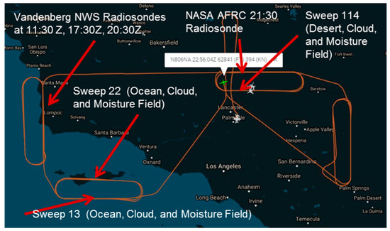 Flight path for NASA ER2 (carrying MISTiC airborne instrument) on 4 December 2017 included hyperspectral imaging observations of wind, temperature, and water vapor over the Channel Islands and nearby ocean, and over Vandenberg and Edwards Air Force Bases where radiosondes that provided an independent observation of weather conditions were launched.