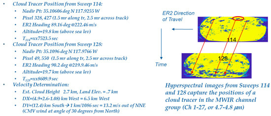 The basic approach to observing the wind employed for MISTiC is the geometrical method first developed for Motion Vector Winds following the introduction of GEO multispectral imagers. The image field is examined for features in the cloud or moisture field that have been moved from one location to another during the time interval, and identifies track-points on these features to allow a quantitative measure of the change. This vector position difference is computed using image data, together with attitude and ephemeris data. In MISTiC Airborne, a feature position is determined from the GPS coordinates of the sweep nadir point, that angular position within the image field, GPS altitude, optics focal length, and FPA pixel size. The wind speed observed is just the magnitude of this vector difference. For the operational GEO AMVs, where thousands of AMVs are derived from a sequence of full-disk images, the manual identification of track-points procedure is too time-intensive, has been replaced by a spatial correlation computation method-but that is not needed, given the relatively much smaller number of image-pairs observed in a MISTiC airborne flight. Moreover, the image pixel-level spatial resolution available from MISTiC airborne is very high (50 m at nadir), compared to that available to GEO MET imagers, simplifying the correct identification of a geometric feature, a wind tracer in multiple positions. Finally, the low altitude of the MISTiC observations and wide angular field introduce substantial geometric distortion of the shape of tracer features as well as a truncation of the feature by the very limited spatial field of view. These are aspects of the images that a human image interpreter can reasonably overcome, but which would pose great difficulties to current automated cross-correlation algorithm. The other critical aspect of the AMV observation is the accurate assignment of height.