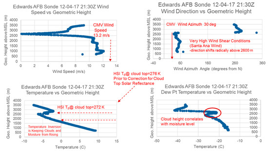 4 December 2017 21:30Z radiosonde observation over Edwards AFB and related MISTiC airborne observations for cloud motion vector winds. The radiosonde observations and MISTiC observations provide a consistent and physically sensible picture of the local thermodynamic and wind environment.