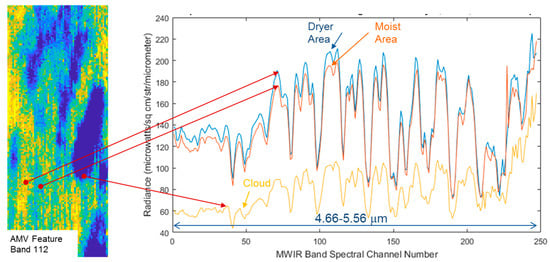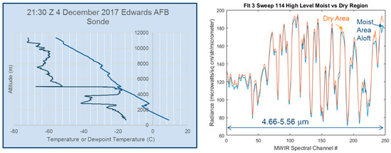 Radiosonde data during MISTiC Edwards over-flight (left) and MISTiC airborne MWIR spectra for areas of dry air and moist air aloft in sweep 114 (right). Spectral channels showing the greatest differences between dry and moist areas in Figure 14 are in the longer wavelength portions of the band that are most sensitive to higher-level water vapor. This is consistent with the high dew-point temperature layer aloft shown in the radiosonde data.