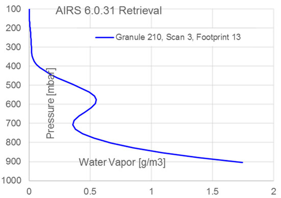 As noted previously, due to the cost constraints under the IIP, the airborne version of the MISTiC instrument employed a previously produced version of the IRFPA, which does not have the full spectra range planned for the MISTiC spectrometer and its custom-grown HgCdTe composition for the detector array. Specifically, it lacks the full spectral channel set needed to fully retrieve the water vapor features at 500 hPa and at higher altitudes. However, as shown in Figure 4, the full MISTiC spectral channel set, with the planned lower wavenumber limit of 1750 cm−1 includes the channels needed to retrieve both the temperature and water vapor through the troposphere, with layer accuracies comparable to AIRS, and would be expected to support water vapor retrievals similar to those provided from AIRS in Figure 16.