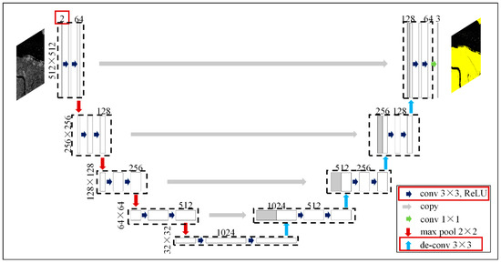 Generation of ship labels through pixel-wise detection methods are considered a semantic segmentation problem. In recent years, deep learning has dominated the field of semantic segmentation. For example, a fully convolutional network [33] was used for land cover mapping based on remote sensing images [34]. An architecture with an encoder–decoder in SegNet (a fully convolutional network for semantic segmentation) was introduced in [35]. Based on the architecture, U-Net was proposed in for the segmentation of biomedical images [36]. Currently, U-Net is used in crop mapping with SAR data [37] and road extraction with optical images [38]. It was proved in [37] that small numbers of training data could drive U-Net and obtain high accuracy in applications.