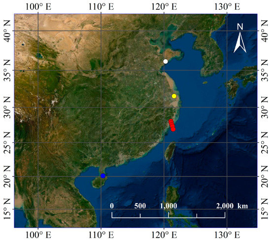Spatial distribution of the data, the dots represent corresponding areas covered by the images we used. Respectively, the white dot represents the Qingdao area, the yellow dot denotes the Shanghai area, the red dots denote the Taizhou area, and the blue dot denotes the Haikou area.