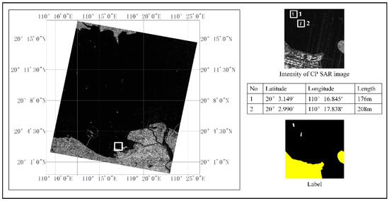 Images were manually labeled with image editing software. Figure 3 shows a general process for ship labeling, through the magnified image (top right) of a specific area (the rectangle area in the left CP SAR image) accompanied with automatic identification system (AIS) information (mid right) and labels (bottom right) correspondingly. Ideally, the length, course, and speed of ships from the AIS data (with latency) can be used to estimate the ships in corresponding SAR images. However, not all ships on the ocean carry AIS transponders [8]. AIS data, particularly the data for archived images, acquired synchronously with satellites is difficult to obtain. Therefore, as in previous studies [13,22,23,24,47,48,49], some images used in this study were labeled with experience and expert knowledge through visual interpretation. Since ship characteristics (including ship superstructure configuration, orientation of a ship with respect to radar beam, ship size, material from which the ship is made) affect the observation (e.g., intensity and geometry) in SAR images and the detectability of ships followed by [8]. Generally, ships appear as pixels with more brightness in intensity of the CP SAR image, compared against ocean background. Accordingly, a ship was determined firstly, mainly based on the characteristics (shape and texture) of the bright pixel cluster in the intensity image. The ship labeling was finally obtained by manually tracing the boundary between the target and background. However, spatial resolution of image (i.e., 8 m) might limit the credibility of labeled targets, especially for the small targets. Accordingly, in this investigation all ships were labeled through a collaborative way, with assumption that a target confirmed by more than two experts was credible for further investigations. As shown in Figure 3 and Figure 4, land is yellow, ships are white, and the sea is black.