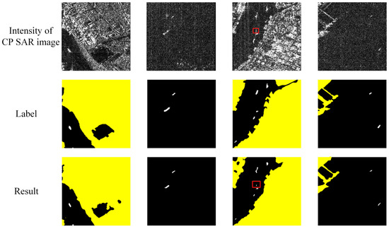 Illustrations of CP SAR images, corresponding label images, and detection results. The false alarm was marked by a red rectangle.