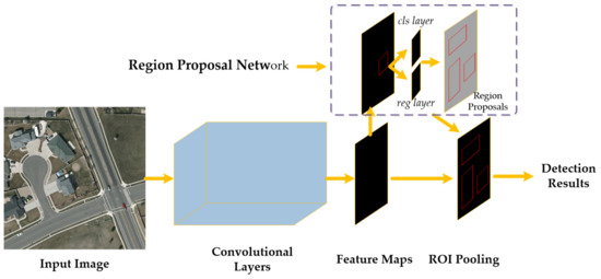 The region proposal approach is used to generate the object-like regions, and the RPN [27] is the first heuristic approach that adopts a CNN to accelerate the generation progress of the region proposals and increase the positioning accuracy. The RPN (shown in Figure 4) is designed based on the VGG-16, which reserves the convolutional layers (from conv1_1 to conv5_3) and deletes the fc6, fc7 and fc8 layers; subsequently, the model slides a small convolutional network over the feature map generated by the deepest convolutional layer. Two sibling layers named reg_layer and cls_layer are connected behind the small network to perform the box regression and classification, respectively.
