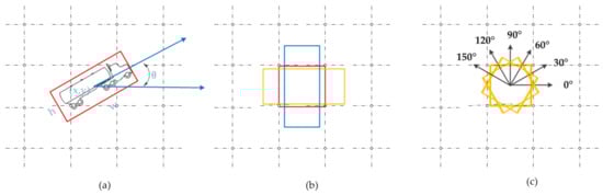 Compared with the traditional anchor scheme, the oriented anchor scheme is suitable for objects in aerial images. The angle parameter θ of the proposal is adopted to determine the orientation of the object. To avoid the computational load of the orientation coverage, we establish a balance; therefore, only 6 orientations (0, π/6, π/3, π/2, 2π/3 and 5π/6) are employed in our experiments. Moreover, the other two parameters (aspect ratio and scale) used in the traditional RPN are adopted as well. We employ 3 aspect ratios [1:1, 2:1, and 1:2] and 4 scales [82, 162, 322, and 642]. Through this scheme, 72 generated regions are obtained at each position of the feature map. The two sibling output layers pred_bbox and pred_score generate 360 outputs (72 × 5) and 144 scores (72 × 2), respectively. The oriented anchor scheme is illustrated in Figure 6.