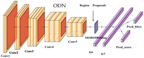 The ODN also adopts the VGG-16 model as the backbone. To extract the feature vector with a fixed length from the region proposals (having multiple sizes, scales and orientations), a MOROI (multiple orientation region of interest) polling layer is added. Behind the MOROI pooling layer, we add the fc_6 and fc_7 layers, which are the two fully connected layers. The ODN is required to output the position and corresponding confidence score of the object. Hence, we add two fc (fully connected) layers behind the fc_7 layer. The detailed illustrations of these aspects are shown in Figure 7.