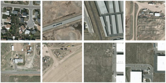 The VEDAI dataset is a benchmark dataset, which includes aerial images having two sizes: VEDAI 1024 (1024 × 1024 pixels) and VEDAI 512 (512 × 512 pixels). These images were recorded in Utah, US during spring 2012 and comprise nine classes of vehicles. The ground sampling distance of VEDAI 1024 is 12.5 cm/pixel, and it is 25 cm/pixel for VEDAI 512. Figure 8 shows some examples of the images in this dataset, which illustrates various backgrounds of the images, such as highways, crops and residential areas. The detailed data distribution of this dataset is presented in Table 2. Nine classes are present in this dataset, however, the objects of some categories such as planes, boats and others are scarce. In our experiments, we discarded these categories and merged the remaining categories (cars, pick-ups, trucks, camping cars, tractors and vans) into a class named vehicle. Hence, approximately 3300 vehicles were adopted for training and testing.