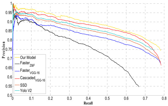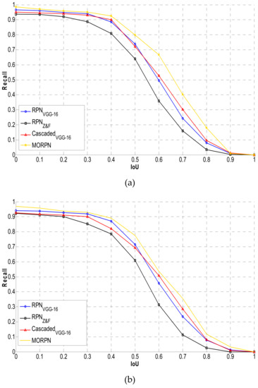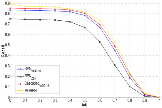 The MORPN is the key component of the proposed model, and the positioning accuracy of the generated region proposal is a key factor that determines the final results. We evaluated the performance of the positioning corresponding to the proposed MORPN and other RPN-based region proposal approaches. The “one-stage” detection models such as the SSD and Yolo V2 were not selected for comparison because these models employed only one CNN for not only object positioning but also detection. In the RPN-based model and the proposed model, the positioning and detection are performed by two independent CNNs. The following experiments focused mainly on the positioning performance of the region proposal networks. In [27], the VGG-16 and Z&F models were adopted as the backbone of the RPN, and the recall–IoU curve was proposed as the evaluation criterion. Therefore, we employed the same criterion (as shown in Figure 10). From the results shown in Figure 10, it can be noted that the proposed model yields the best recall rate with the IoU rate ranging from 0 to 1; therefore, the MORPN exhibits the best positioning performance.