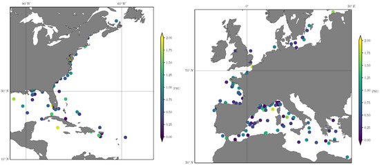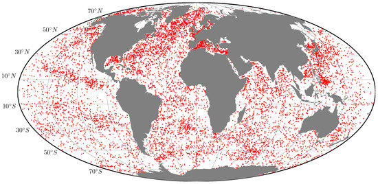 In situ data from the Global Ocean, Arctic Ocean, Baltic Sea, European North-West Shelf Seas, Iberia–Biscay–Ireland Regional Seas, Mediterranean Sea, and Black Sea have been collected for the purpose of this paper. The data has been obtained from Copernicus Marine In Situ, [4]. Two types of datasets are provided in the Copernicus in situ component. The Reprocessed (REP) dataset is processed and validated, and thus delivered in delayed mode, which means that the information is updated on a yearly basis. On the other hand, the Near-Real-Time (NRT) dataset is provided nearly instantaneously, but the level of preprocessing is minimal, accounting for higher uncertainties. The in situ delayed mode product is designed for reanalysis purposes, and integrates the best available version of in situ data for SST and SSS measurements, [21,22]. These data are collected from ICOS Ocean Thematic Centre operational stations, using Standard Operating Procedures for the ocean carbon community.