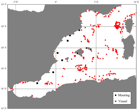 Figure 2. Map of the Western Mediterranean Sea showing an example subset with location of observations from moorings (black squares), and vessels (red dots).