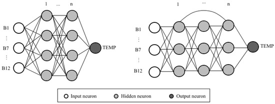 Figure 3. Schematic of the structures of neural networks used in the paper with temperature as example output. Deep Neural Network (left) and Deep Neural Network with shortcuts (right). The sketches represents networks with n layers fully connected; the input neurons are the variables summarised in Table 4 and Table 5— note that band QA60 has not been used as input for the Neural Network.