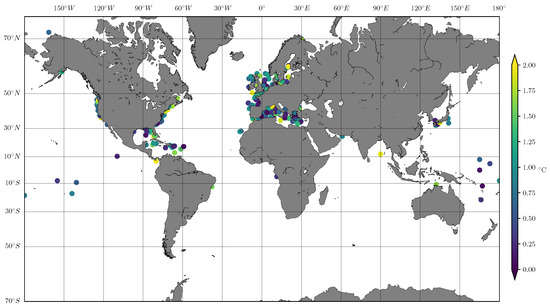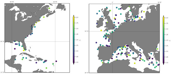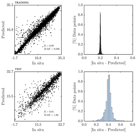 The test dataset is mainly located around Europe and North America, with some points around the Caribbean and Polynesia. Correlation values are over 90 % in both training and test sets, showing a very good agreement between predicted and expected data. MAE is below 1.9 ° C for the test dataset. Residuals are centred around 0.4 ° C, which is the most common error in the test dataset for more than 90 % of the data. This result linked to the MAE shows how most of the data is fitted well, but there are some outliers that differ significantly from the expected value, modifying the mean error. Looking at the distribution of errors around Europe in Figure 5, most of the values around the French coast, English Channel and North Sea show a very good agreement with errors below 0.5 ° C, while the Mediterranean has some outliers reaching 1.5 ° C in some points near Marseille. Otherwise, a good agreement is also observed in this area. In the US coast, agreement is also good.