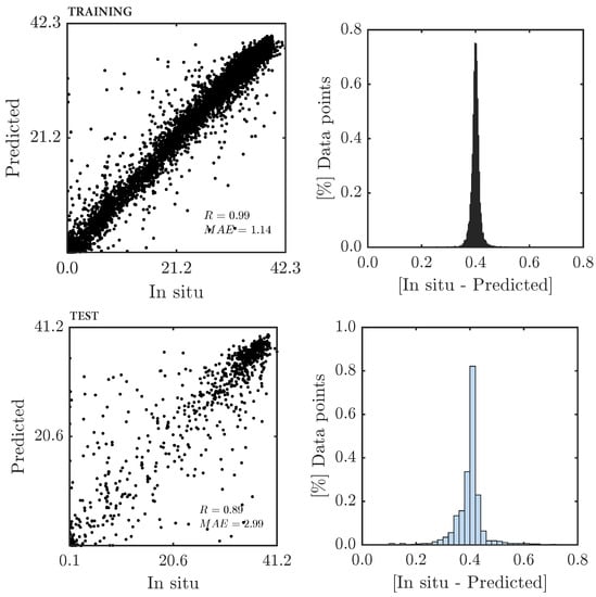 Salinity interpolation shows poorer results than their temperature equivalents. Most of the randomly selected test data is located in the Mediterranean and in the west and east coasts of the US, with some points around the Canary islands, Oman and Australia. In this case, test correlation reaches 89 % , with a mean absolute error of 3 PSU, while the most common error lies around 0.4 PSU, Figure 6. As in the case of temperature, the most common difference is very good, but the existence of outliers makes the mean error increase significantly. The methodology followed in this paper takes into account an area of 100 × 100 m around the in situ measurement location, providing an averaging on reflection conditions or sea foam. However, the presence of other factors at a bigger scale, such as algae patches, vessels, or other external features in the surroundings could affect the final value used as input to the neural network. Outliers are observed to be randomly located and isolated, and thus the presence of external features altering the averaging value of the region around the measurement point could be the cause for the existence of outliers in the prediction capability of the network. Another possible reason is linked to the fact that in situ measuring devices are not perfectly calibrated, and that can lead to a mismatch between observation and prediction. However, given that these instruments have been monitored and checked by different systems, this reason is unlikely to be the cause of outliers in the prediction.