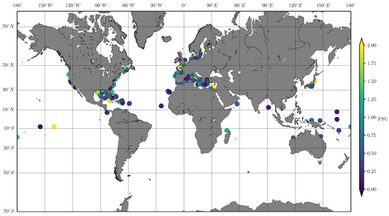 Focusing on the zoomed results provided in Figure 7 around the US east coast and Europe, the agreement in the Mediterranean is very good, with most of the results showing errors below 0.5 PSU. The points around the US also show very good agreement, with localised outliers in the Gulf of Mexico and below Cuba.