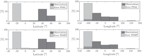 The higher number of observations is located in latitudes around 30 ° to 50 ° (Europe, North America and Japan) and longitudes around 75 ° to 25 ° (Atlantic Ocean), decreasing constantly towards the rest of the regions. On the other hand, most of the errors are located in latitudes of 30 ° to 10 ° (South America, South Africa and Australia), and longitudes of 125 ° to 75 ° (Pacific Ocean). If we combine both latitude and longitude with the higher source of errors, the most affected region is the South Pacific, opposite the Chilean coasts. There is a clear North–South bias due to the amount of available information. Future studies might be able to reduce the uncertainty in these regions by including more in situ observations.