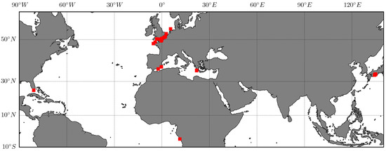 There are more than 14,000 platforms worldwide with available data from 2015 (the coverage period of Sentinel-2), and taking only platforms with salinity and temperature, that number reduces to around 4600, see Figure 1. Due to the amount of information, it is not possible to provide the detail of all the platforms, but as a detailed example, a list of the mooring platforms in the Western Mediterranean Sea is provided in Table 3 (please note that the number of observations represent those that have matching satellite data). For each platform, SST and SSS have been obtained. Moreover, a map marking the points where the specific buoys are located is given in Figure 2.