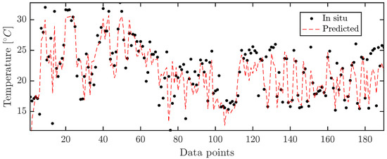 Figure 4 shows temperature interpolation for a random 10 % of the data. The test data is shown in the bottom panel, together with the variation between expected and estimated data in a colour scale. The goodness of fit is calculated using the Pearson correlation coefficient R and the mean absolute error ( M A E ). M A E is defined in Equation (5), and R is defined as follows: