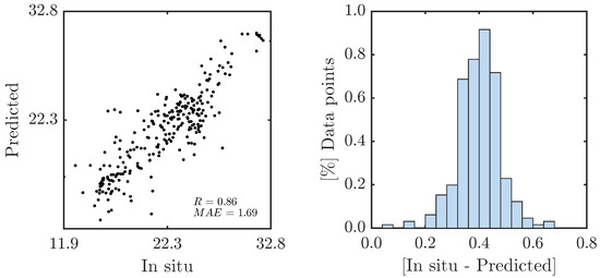 Figure 11. Temperature extrapolation. Test: predicted and in situ data time series (top); predicted vs. in situ data (bottom left); histogram of residuals (bottom right). Units of temperature are ° C.