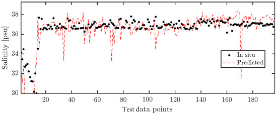 The neural network presented in this paper outperformed classical architectures tested for regression problems. The Sentinel-2 data was processed using Google Earth Engine in areas of 100 m × 100 m around relevant platforms. Accurate salinity values are estimated for the first time without using temperature as input in the network. Salinity results depend only on direct satellite observations. However, a clear dependency on temperature ranges is observed, with less accurate estimations for location where ocean temperature falls below 10 ° C. The reasons for this is unclear from the findings presented in this paper, but could be linked to the amount of available data in areas with lower temperatures and the ability of the network to predict them, or the presence of other physical phenomena such as freezing and mixing. In order to overcome this issue more information is needed in higher latitudes and areas where other phenomena, such as mixing processes and freezing, are representative. Extended information would also help reducing the amount of uncertainties on outliers in prediction.