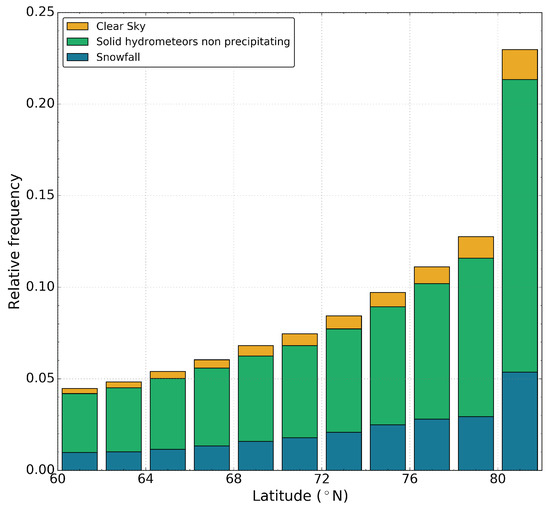 The latitudinal distribution of the profiles as a function of the type of precipitating event is presented in Figure 2. Three distinct types of events were identified: snowfall-only, solid hydrometeors (mostly ice) without snowfall at the ground/, and clear-sky conditions. Snowfall at the ground was determined using CloudSat 2C-SP, while the presence of solid hydrometeors was deduced from the DARDAR MASKproduct. Profiles characterized by DARDAR MASK as “others” (such as aerosol and dust) and “unknown” were removed from the dataset. The number of profiles increases with latitude due to the quasi-polar orbit of CloudSat. The detected snowfall profiles represent approximately 13% of all profiles, while clear-sky profiles and non-precipitating ice profiles represent nearly 10% and approximately 77% of all profiles, respectively.