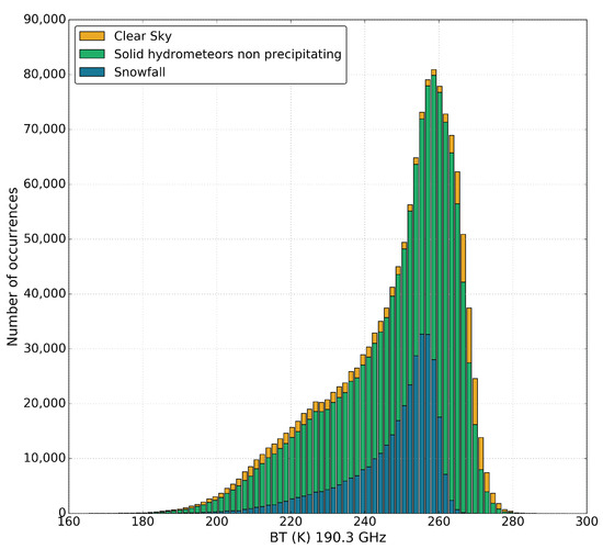 Number of occurrences as a function of the BT (K) at 190.3 GHz for the different types of detected events.