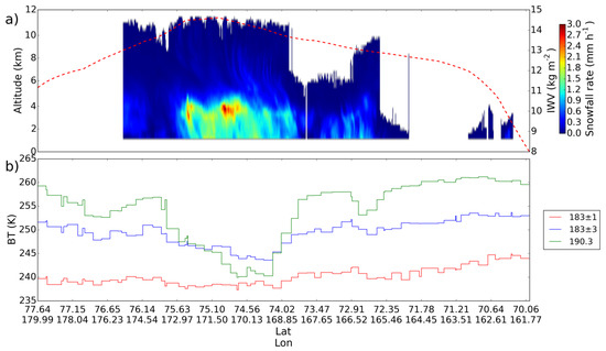 Co-located observations of CloudSat and MHS (on NOAA-18) along the CloudSat track over a snowfall event located north of Siberia on 30 November 2007. (a) Snowfall rate profiles (mm h−1, left axis) from CloudSat 2C-SP. The red line corresponds to integrated water vapor (IWV) (kg m−2, right axis) from ECMWF-AUX. (b) Co-located BT (K) measurements from MHS for 183.3 ± 1 GHz, 183.3 ± 3 GHz, and 190.3 GHz.