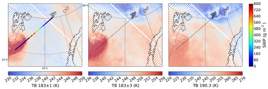 BT (K) measured by MHS for 183.3 ± 1 GHz, 183.3 ± 3 GHz, and 190.3 GHz (from left to right). The black line indicates the CloudSat overpass seen in Figure 4, while the black dot shows the beginning of the track. In the left panel, the CloudSat track shows snow water path (SWP) (g m−2).