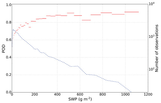 Here, the SWP value used to identify snowfall events in the CPR-MHS dataset was employed to evaluate the detection skill of the algorithm. As can be seen in Figure 8, POD increased with SWP; it exceeded 0.8 from approximately 200 g m−2 and reached 0.9 above 400 g m−2. However, note that SWP in the coincident database had a range of 0–1000 g m−2 with 90% of all profiles below 220 g m−2. This result demonstrates that the RF algorithm had a greater ability to detect intense snowfall than weak snowfall events.