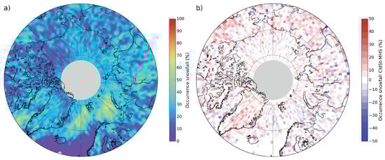 - Snowfall occurrence differences between CloudSat and the RF algorithm using MHS observations were computed. On average, the snowfall occurrence of CloudSat was 4% higher than that of MHS. These differences were up to 30% over Greenland and the Alaska Range likely due to the dryness of these areas and were as much as −30% over the North Atlantic likely due to the occurrence of mixed phase precipitation.
