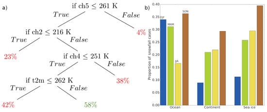 (a) Decision tree classifier with the environmental variables and BT as inputs. The percentage of the number of snowfall cases with respect to the total number of profiles is shown for each leaf node. Proportions greater than 50% are shown in green; otherwise, they are shown in red. (b) Proportion of snowfall events in the “snowfall group” with respect to the total number of snowfall events as a function of the season and the surface type.