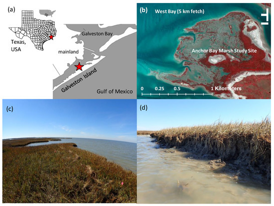 (a) Location of the marsh area study site in relation to its location on Galveston Island, Texas. (b) False color composite aerial imagery of the marsh study site in Anchor Bay. (c) and (d) Photos of the marsh study site taken on 26 February, 2015.