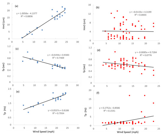 Wind directional group (WDG) 1 (left column in blue) and WDG 3 (right column in red) regression analysis for wind speed (independent) versus dependent variables (a) and (b) significant wave height (Hm0); (c) and (d) wave period (fp); and (e) and (f) wave frequency (Tp). Note that the y axis units are different on each graph.
