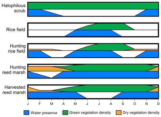 Monthly hydroperiod and vegetation development for different wetland types in relation to human uses in Camargue.